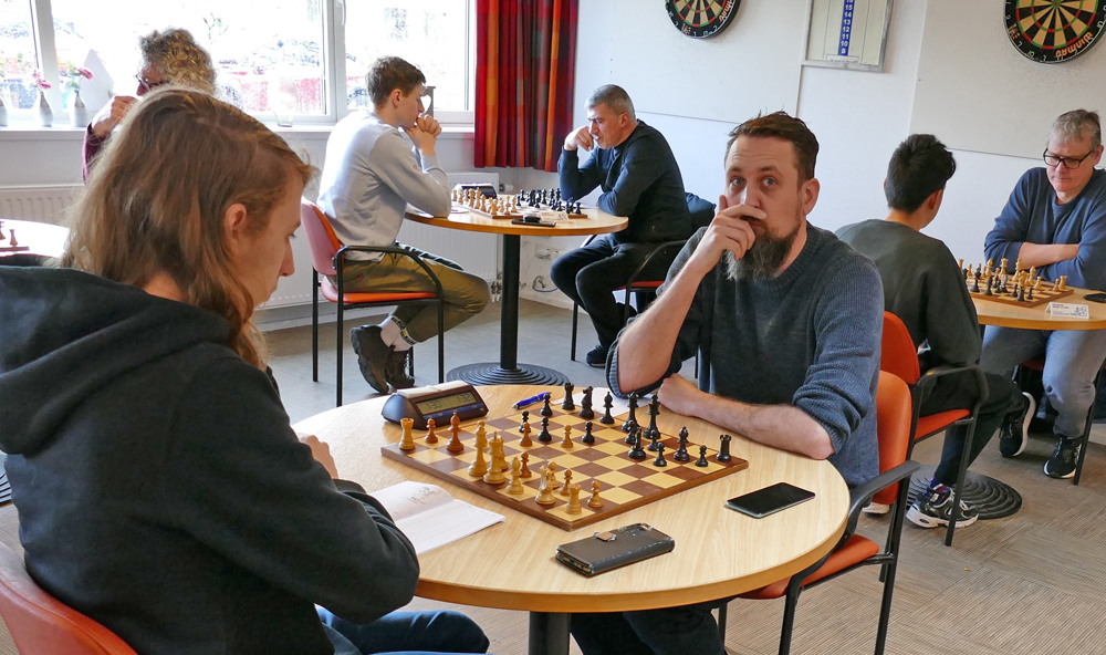 Even dacht ik dat ik er draaierig van werd. We smaakten het genoegen om aan losse tafeltjes tegen T.A.L. 3 te spelen. Wij met het gezicht gericht naar de muur, zij keken oostwaarts naar de deur. Bleek de situatie aan een bord toch omgedraaid, voor de argeloze toeschouwer nogal misleidend. Maar waren die er eigenlijk wel? Dan gestommel aan een ander tafeltje waar na 8 zetten door een omstander werd opgemerkt dat daar het bord een kwartslag gedraaid was, dus met een wit veld a1. De spelers besloten opnieuw met hun partij te beginnen. Draaien altijd maar draaien. Hallucinant. Dat nam me mee in de mijmering. From Russia with love, denkelijk een James Bond film, dus tipically English. Ik zag aan de borden Engels, het London systeem en het Wolga gambiet gespeeld worden. Ik draaide wat door op dat thema totdat ik hieruit hard wakker schrok. Niks uit Rusland met liefde, daar passen nu andere associaties bij. En niks, het slaan van zijn paard op d5, waarom dat a tempo gespeeld, waarom niet even nagedacht, zou ik niet op mijn handen blijven zitten om te impulsieve zetten te weren, afgelopen maandag kostte me dat ook al bijna de partij in de interne. Om mijn niveau maar even te duiden, in het post mortem bleek dit slaan juist de beste zet. Maar goed, ik was klaar wakker en kon de partij heel schematisch naar me toe trekken met een ver opgerukte b pion die zijn toren en later zijn koning bond, waardoor ik op de koningsvleugel met mijn pionnen gecontroleerd op kon rukken totdat werd ingezien dat promotie naar dame niet meer te keren was.
