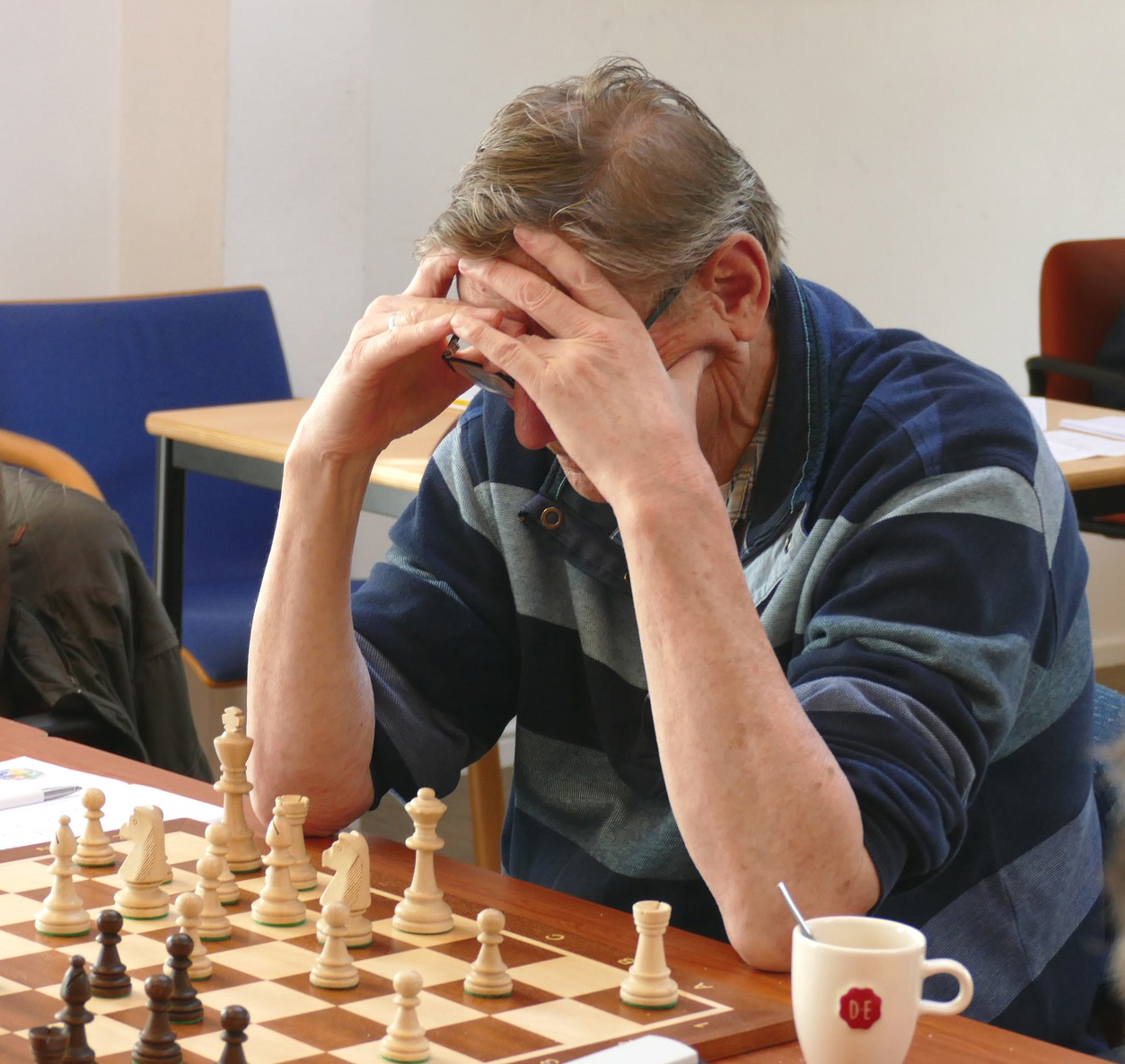 Dan speelt alleen Jan Willem nog. Stond eerder in de partij al op het punt een pion te winnen door met zijn paard de verdediger te bestoken. Maar wacht, zijn paard en koning staan nu op dezelfde diagonaal, en de tegenstander zet de loper ertussenin. Oei. Weg paard, en weg stelling. Balen, rug rechten, en doorspelen. Pionnetje hier ruilen, pionnetje daar. Inmiddels wordt het kijken naar welk remiseplan mogelijk is.