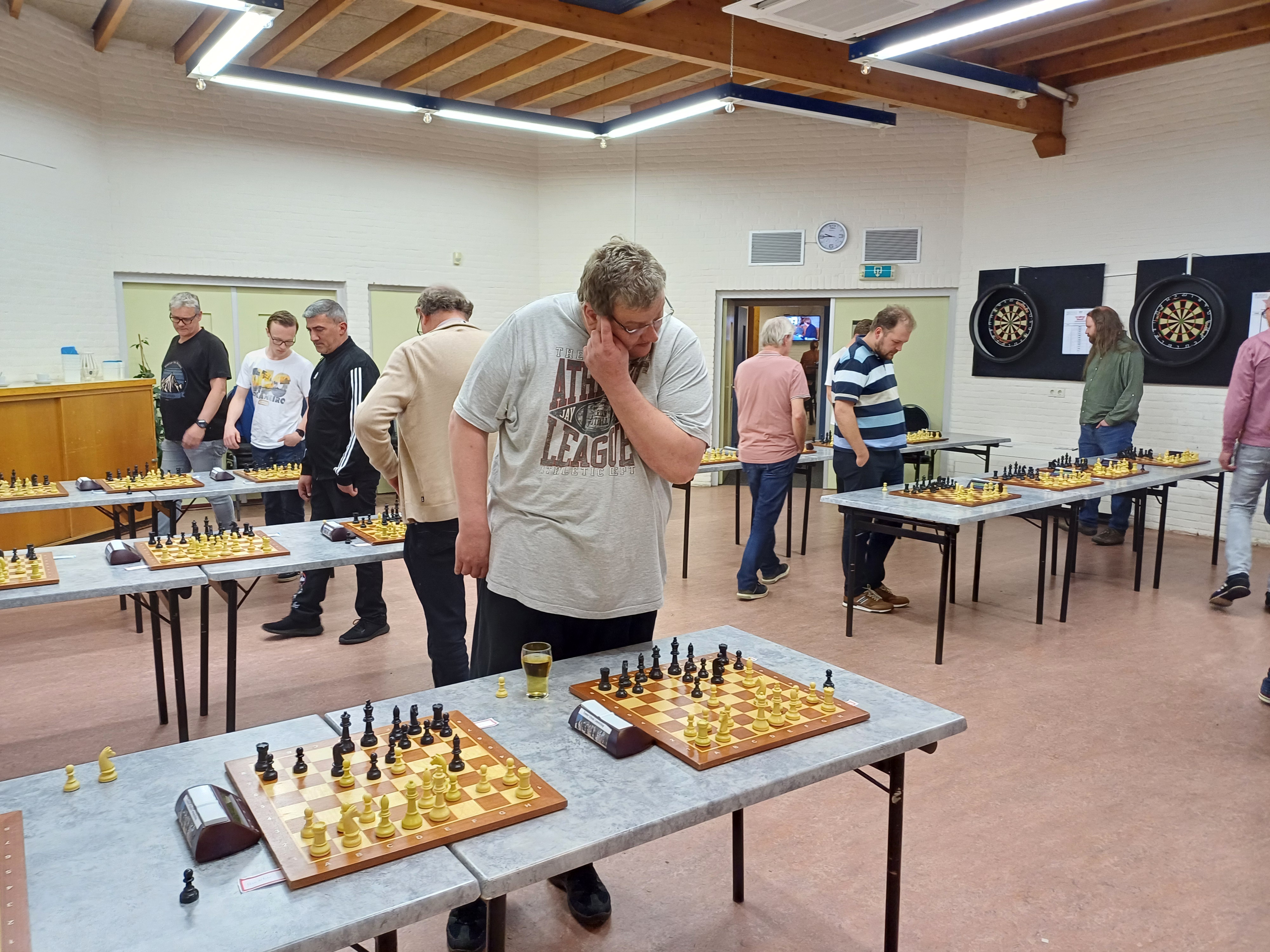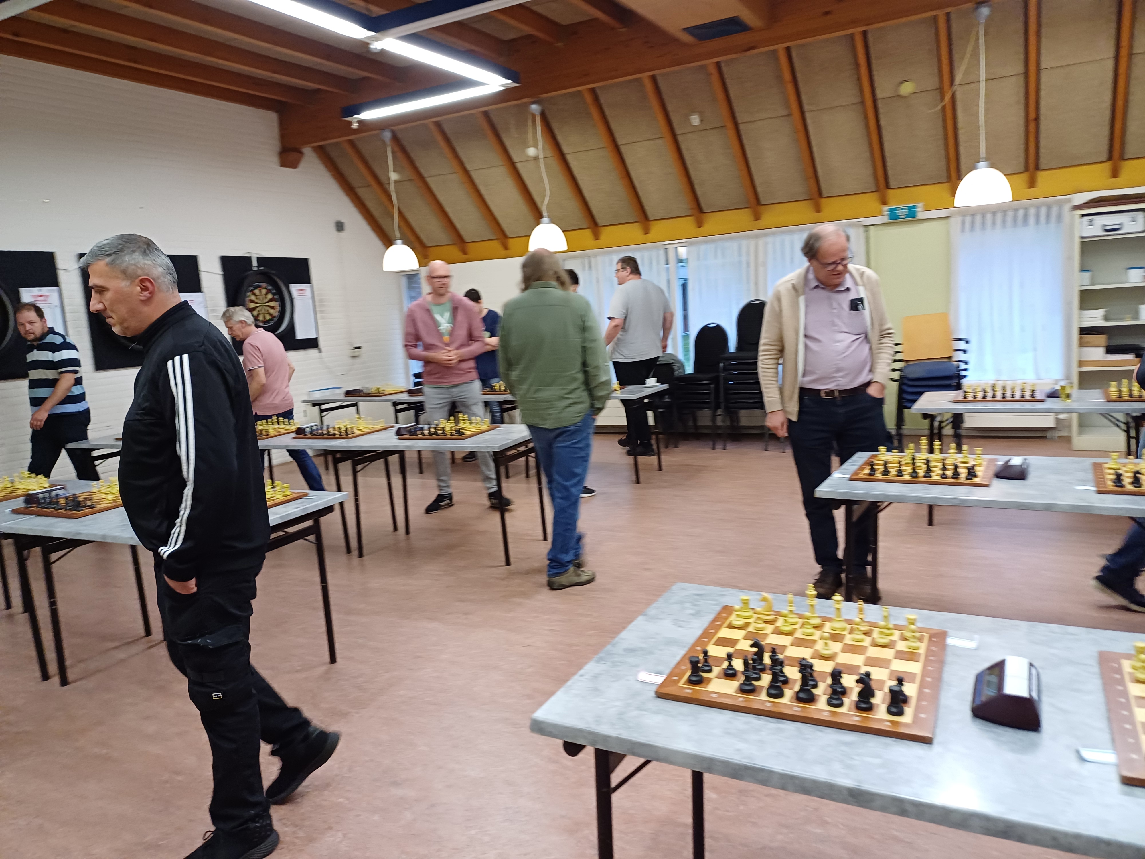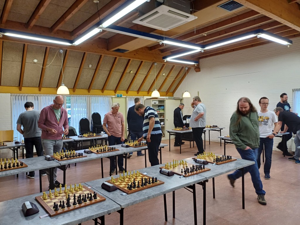 Een goede opkomst, waarbij ook twee belangstellenden, met 15 spelers, 23 benodigde borden, waarmee de aanwezige voorraad aan speelmateriaal en klokken nog net genoeg bleek en mooie strijd in partijen met een bedenktijd van 90 minuten p.p.. Een avond die heel goed past in de seizoenafsluiting van ESG. Enthousiasme alom bij de deelnemers, die allen op drie borden tegelijk de strijd aan bonden tegen gelijkwaardige tegenstanders. De resultaten heb ik niet bij kunnen houden. Wel heb ik vastgesteld dat onze voorzitter, Willem Boontje, de avond op een prima wijze georganiseerd heeft.