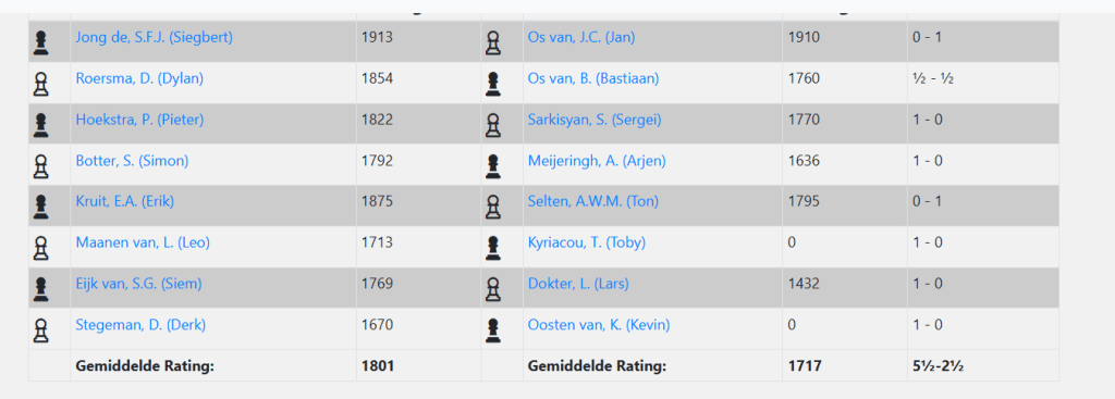 Op papier is ESG 2 redelijk kansloos in de uitwedstrijd tegen Philidor 1846 3 in Leeuwaren. Zouden we onze niet gerate spelers op 1550 schatten, dan is het rating verschil dik 125 punten gemiddeld per bord. Maar we leveren strijd waarvoor we waard zijn om uiteindelijk met 5,5 – 2,5 ten onder te gaan.