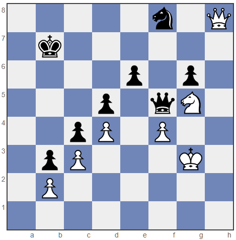 We komen in de partij dat wit net met Lxg4 het zwarte paard heeft buitgemaakt. Als zwart fxg4 terug slaat houdt ze een gezonde stelling over met een plusje. Zwart wilde echter meer…