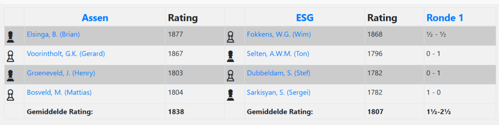 Al snel stond het eerste resultaat op papier. Wim kwam prettig uit de opening maar had zo zijn reden om remise aan te bieden. Dit werd geaccepteerd. Ikzelf schrok van een intimiderende aanval op de koningsvleugel uitgevoerd door en dame op h5, vier schouder een schouder oprukkende pionnen die ondersteund werden door lopers en een paard. Na 20 minuten leek me negeren hiervan nog het best om zelf op de andere vleugel de aanval te openen. Geheel in mijn inmiddels bijna geheel afgezworen oude stijl, plaatste ik een paardoffer tegen twee centrumpionnen en toen mijn tegenstander even later een aftrekschaak op de loper over het hoofd zag, was het pleit eigenlijk al beslecht. In de partij ging het voor hem van kwaad tot erger, zijn stukken sneuvelden als rijpe appels van de boom tot zijn definitieve overgave. Ik blikte op het bord van Sergei, vond het netjes gelijk staan, maar in mijn volgende afwezigheid, het schakelprogramma van ESPN in de kantine liet mij het einde van Jong PSV tegen Vitesse meemaken, bleken penningen over en weer Sergei een vol paard te hebben gekost, waarna hij wel moest opgeven.