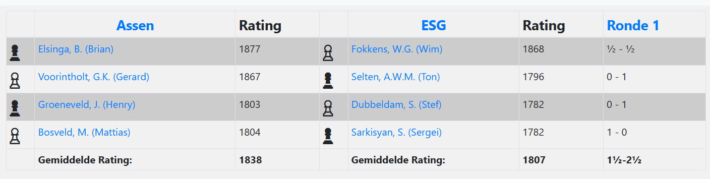Al snel stond het eerste resultaat op papier. Wim kwam prettig uit de opening maar had zo zijn reden om remise aan te bieden. Dit werd geaccepteerd. Ikzelf schrok van een intimiderende aanval op de koningsvleugel uitgevoerd door en dame op h5, vier schouder een schouder oprukkende pionnen die ondersteund werden door lopers en een paard. Na 20 minuten leek me negeren hiervan nog het best om zelf op de andere vleugel de aanval te openen. Geheel in mijn inmiddels bijna geheel afgezworen oude stijl, plaatste ik een paardoffer tegen twee centrumpionnen en toen mijn tegenstander even later een aftrekschaak op de loper over het hoofd zag, was het pleit eigenlijk al beslecht. In de partij ging het voor hem van kwaad tot erger, zijn stukken sneuvelden als rijpe appels van de boom tot zijn definitieve overgave. Ik blikte op het bord van Sergei, vond het netjes gelijk staan, maar in mijn volgende afwezigheid, het schakelprogramma van ESPN in de kantine liet mij het einde van Jong PSV tegen Vitesse meemaken, bleken penningen over en weer Sergei een vol paard te hebben gekost, waarna hij wel moest opgeven.