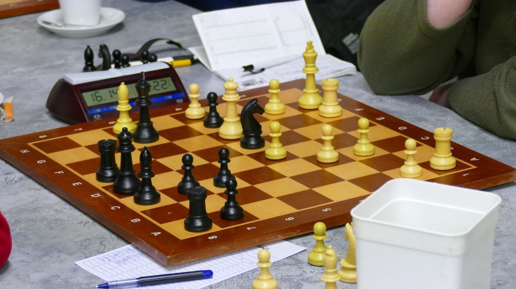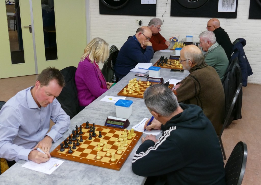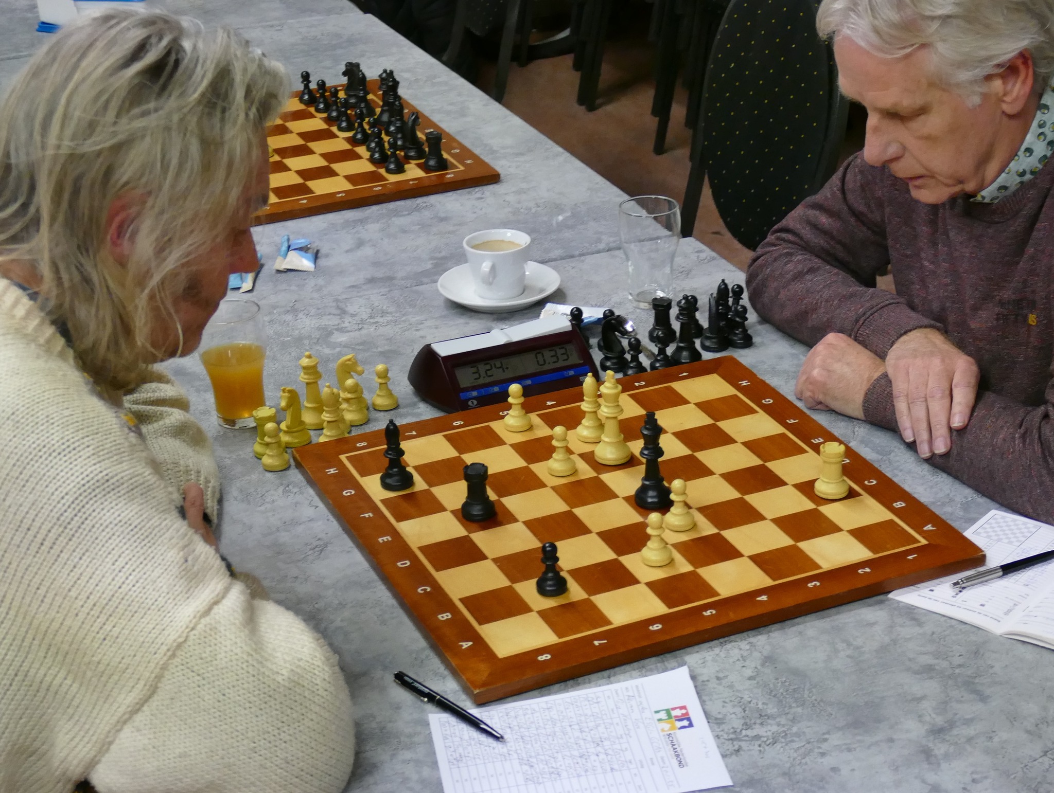 Om 10.35 kwamen er vlot achter elkaar twee verliespartijen voor ons. Rienk had een pion weggeven en bleef daarnaast zitten met een onveilige koning. De tegenstander maakte dat goed af.