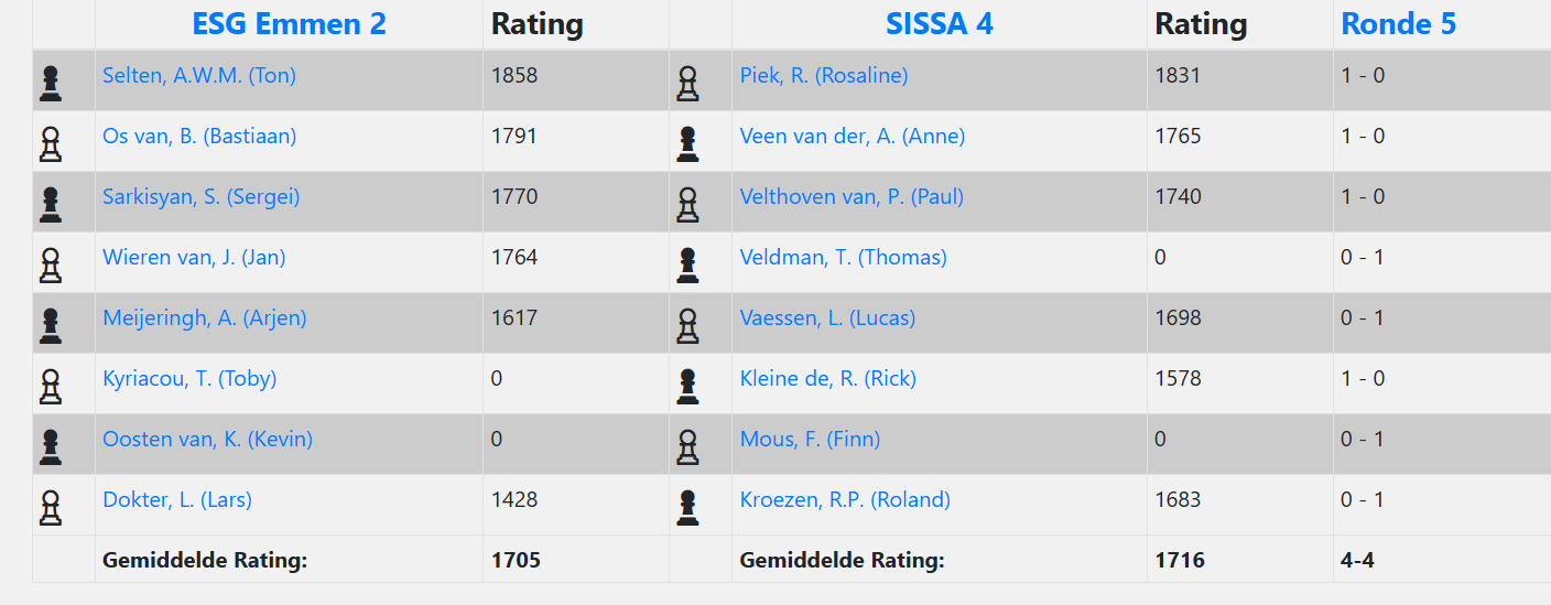 Ik blijf in lastig vaarwater verkeren, maar mijn tegenstander laat wat steken vallen. Vooral mijn dame uitval naar h4 toe te staan is verkeerd. Ik neem het initiatief over en werk aan een niet te stoppen mataanval. Een gelukkige winst. Veel mooier zijn de winstvoeringen van Toby, Sergei en Bastiaan. Toby, die met twee pionnen en het torenpaar recht op de vijandelijke koning afstormt en daarbij ook nog even een tegenaanval ontzenuwt. En Sergei die met een sluwe combinatie een pion wint en het bord beheerst. Bastiaan die zorgvuldig met kleine middelen zich richt op een zwakke pion en dat voordeeltje gestaag uitbouwt. We staan 4-3 voor!