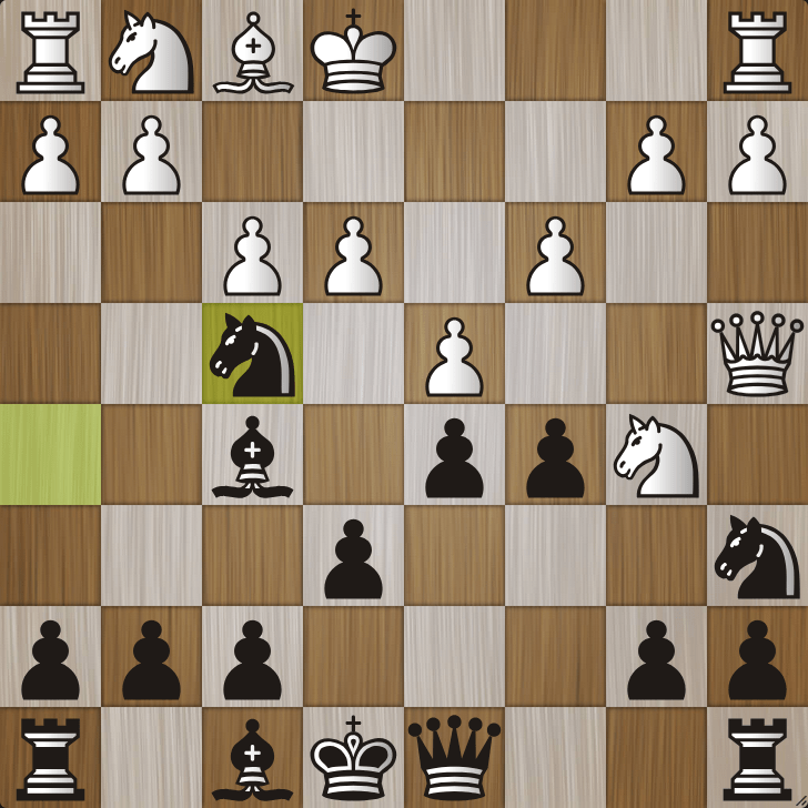Hier zie ik Nb5 van wit aankomen met druk op c7. Echter, kies ik hier niet de beste manier om te verdedigen. Ik dacht dat ik d5 moest versterken en met Na6 c7 genoeg kon dekken, maar dat blijkt later lastig. Het beste is om gewoon Nc6 te spelen, want op Nb5 kan zwart dan Rc8 spelen.