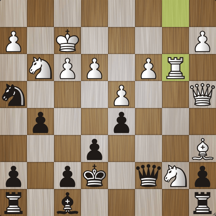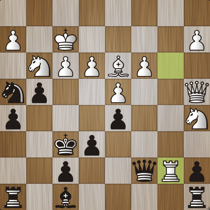 Hier gaf wit op. De loper en de dame kunnen op de h-lijn gezet worden om het schaak van de toren te blokkeren, maar zodra witte dame op h3 wordt gezet, komt de zwarte dame op g1 met mat.