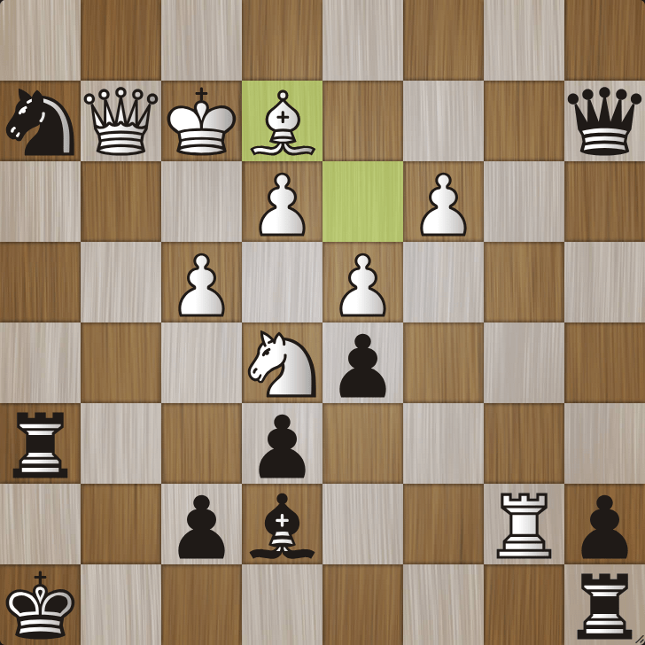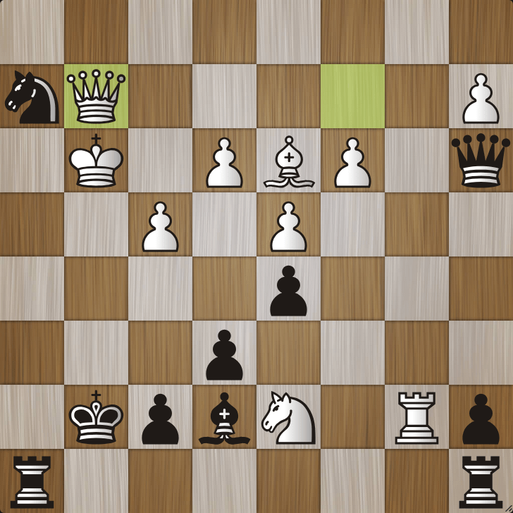 Hier kan wit het stukkenbalans herstellen door op a6 te slaan met de dame of de loper, wat gelijk het paard op b7 dekt. Zwart kan daarentegen slaan op b2 met een aanval op de toren op a1. De computer geeft als beste variant het volgende:
