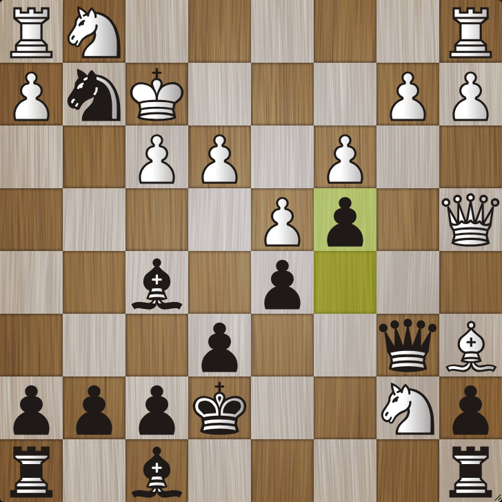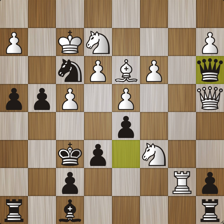 Met een score van -2.1 in het voordeel van zwart. Dit is verre van het einde van de variant, de zwarte koning staat op g6 en voor beide spelers staat er een paard in, maar dit is even om aan te geven hoe tactisch de stelling is.