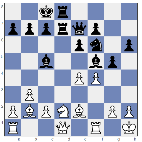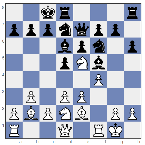 In deze stelling speelde zwart 10. … g5, met het idee om de witte koningstelling aan te vallen. Maar ik was erg blij deze zet te zien – de loper op b2 komt nu tot leven.