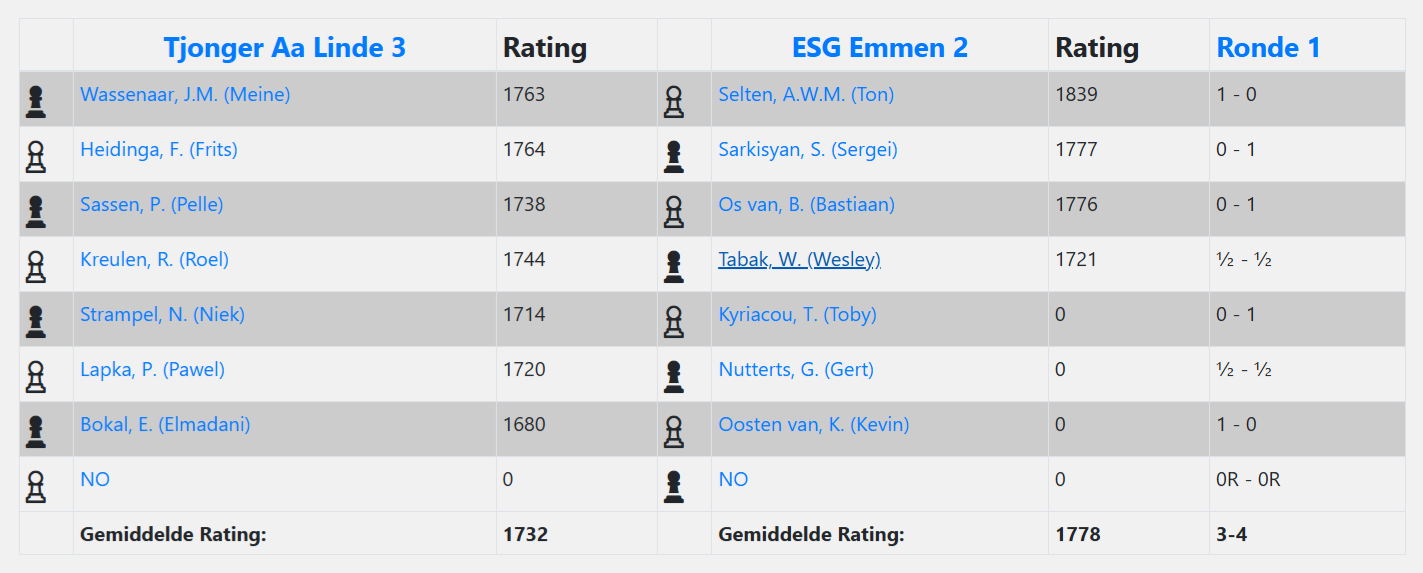 En Gert was het eerst klaar. Met de aantekening dat de ontwikkeling van zijn tegenstander traag op gang kwam, werd in gelijke stelling na bijna twee uur spelen remise overeengekomen. Niet veel laten volgde de winst van Bastiaan in een partij waarin mij vooral het bijzondere stellingsbeeld van schuin tegenover elkaar staande dubbelpionnen op de a en b lijn was opgevallen. Na de remise van Wesley, in een correcte en zeer evenwichtige strijd, en de winst van Toby, die langzaam maar zeker zijn tegenstander fijnkneep, beloonde Sergei zichzelf met een soeverein gespeeld eindspel en stelde daarmee de winst voor ons team veilig. Jammer dat Kevin daarna verloor. Hij was er dichtbij, maar miste net een beetje stellingsgeluk in een pionneneindspel.
