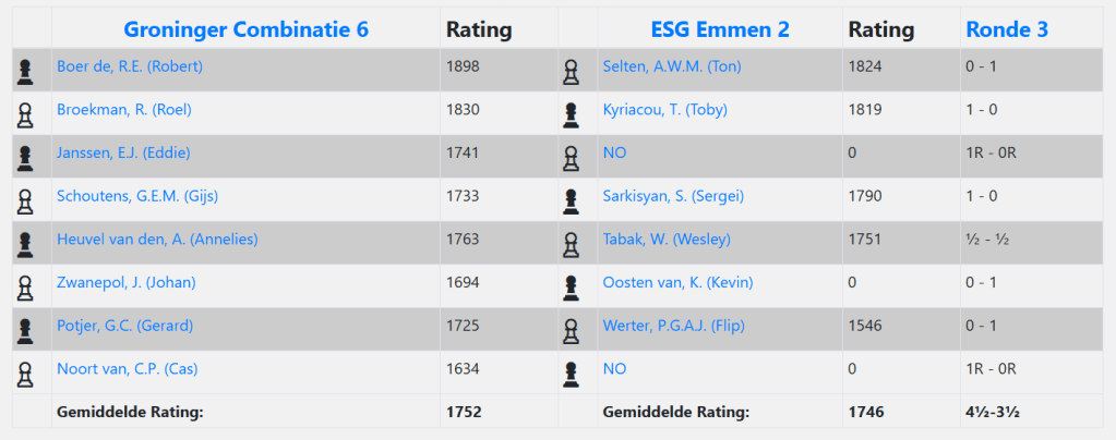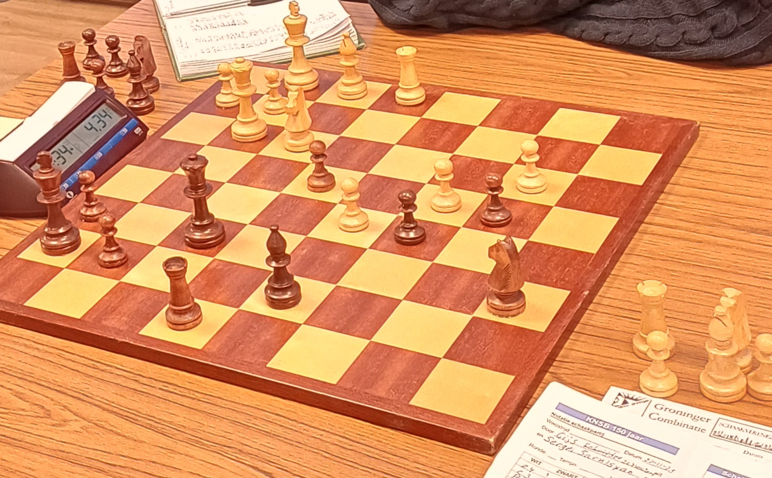 En eigenlijk wonnen we ook. Aan de borden behaalden we een 3,5 – 2,5 overwinning op Groninger Combinatie 6. Reglementair verloren we met 3,5 – 4,5. Immers Bastiaan hadden we afgestaan aan het eerste, ons vlaggenschap, invallers waren niet beschikbaar en door een no-show bleef ook een tweede bord leeg.
