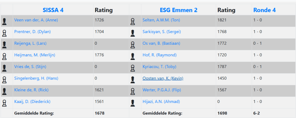 Sergei leidt het inmiddels verwachte verlies. Zo ook Raymond. Maar dat ik in een partij waarin ik lange tijd veel beter heb gestaan, met een absolute braakzet mat in 3 weggeef, is onvergeeflijk. We staan 6-0 achter.