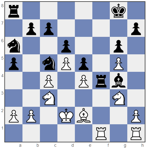 Bh3 22. Rxf4 exf4 23. Nf1 Bg2 24. Rg1 Nxe4+ 25. Nxe4 Bxe4 26. Rg4 Rf8