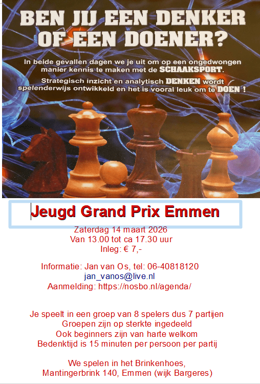 Dan zijn wij op zoek naar u! De schaakvereniging ESG in Emmen verwelkomt nieuwe leden van harte in haar vereniging. Wij spelen op maandagavond vanaf 19:45 uur (jeugd om 18:30 uur) in wijk- centrum ’t Brinkenhoes, Mantingerbrink 140 in Emmen-Bargeres.