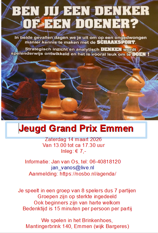 Dan zijn wij op zoek naar u! De schaakvereniging ESG in Emmen verwelkomt nieuwe leden van harte in haar vereniging. Wij spelen op maandagavond vanaf 19:45 uur (jeugd om 18:30 uur) in wijk- centrum ’t Brinkenhoes, Mantingerbrink 140 in Emmen-Bargeres.