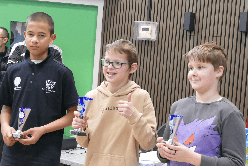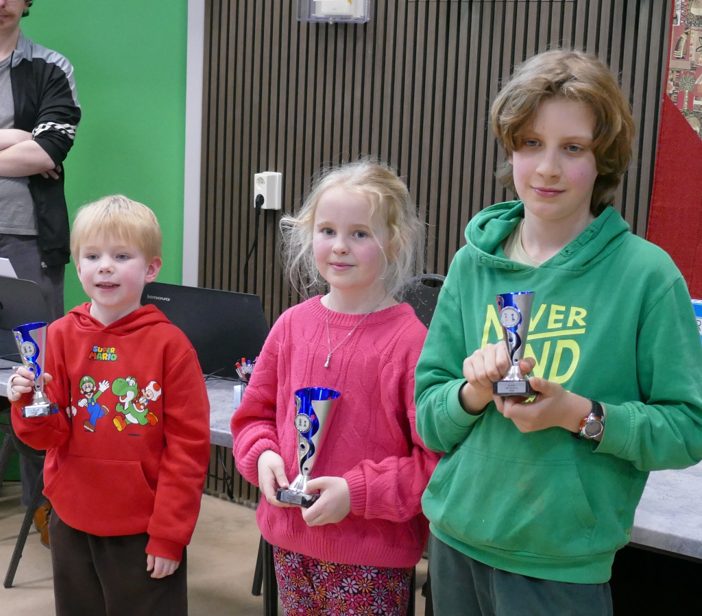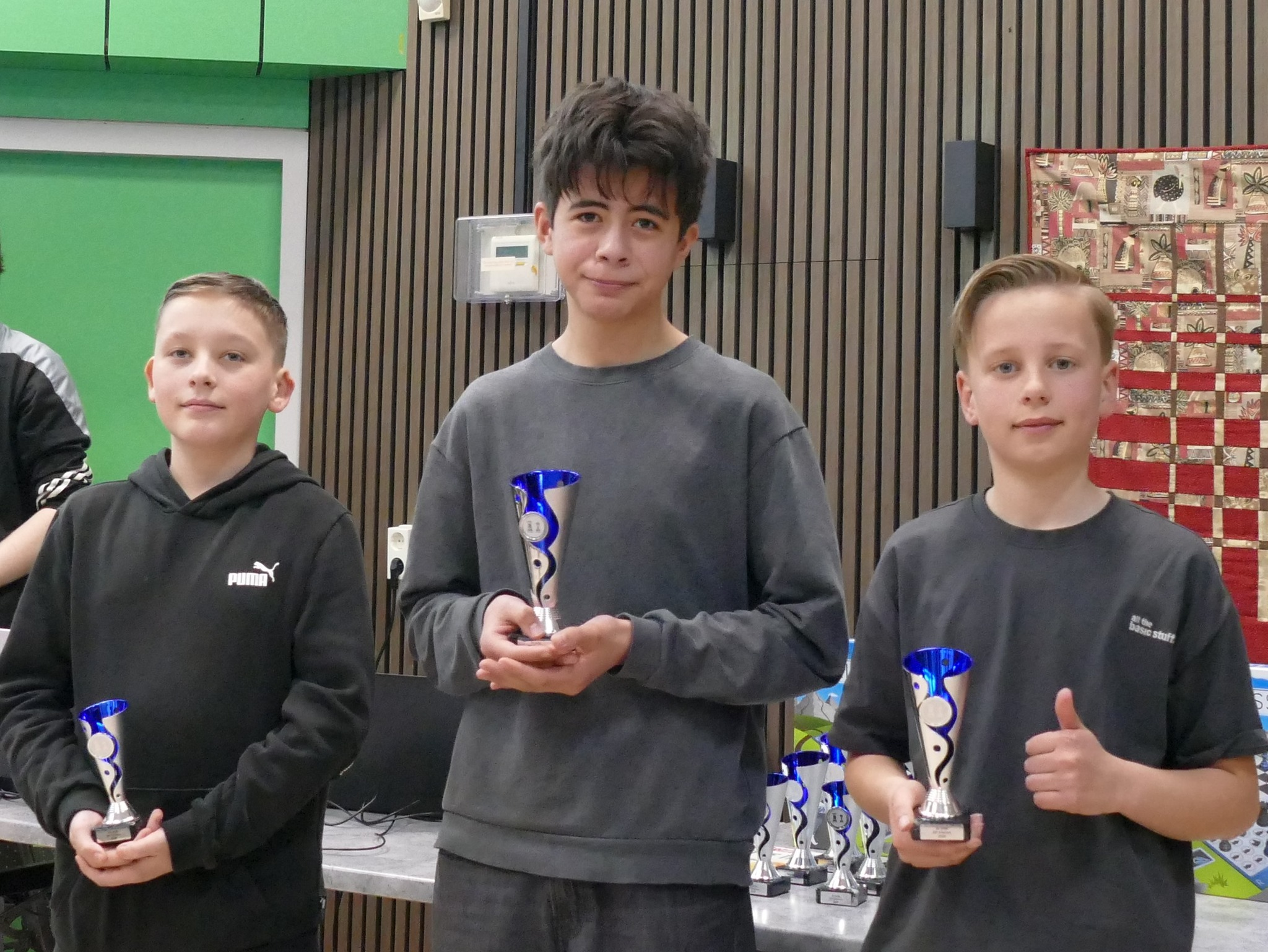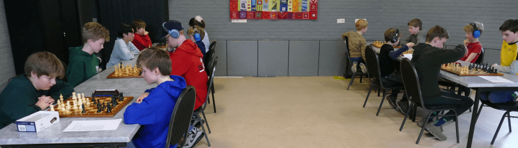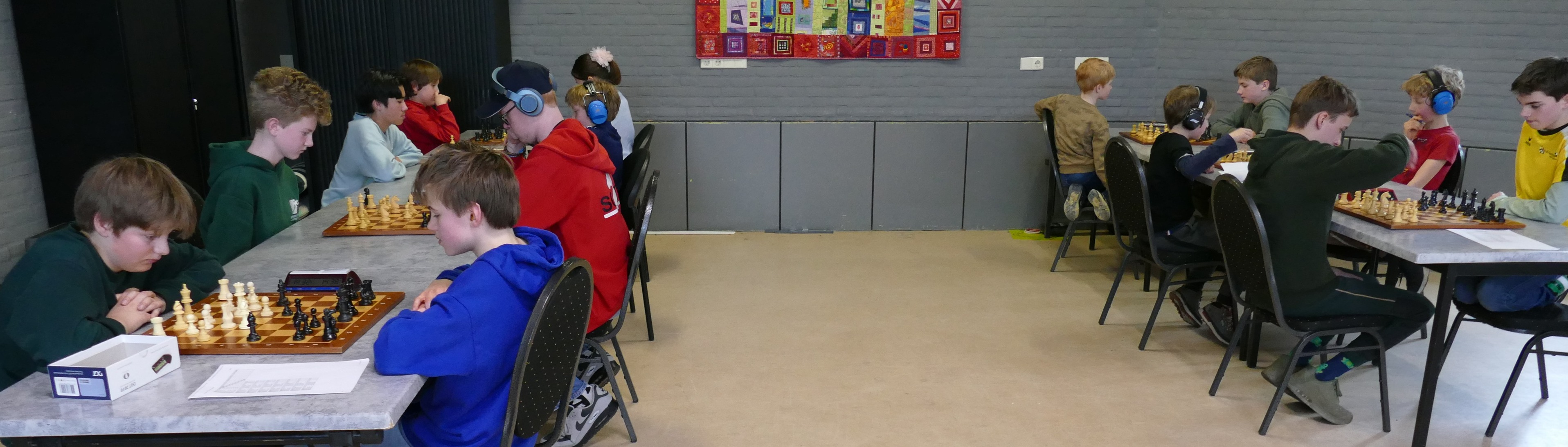 En dan de A-groep. Die bestond uit zes spelers en speelden dus vijf ronden met iets langere bedenktijd. Net als in de B-groep werd er hier hevig gestreden met enkele lange en ook goede partijen. Wart Koopman (Groningen) werd eerste met 3,5 punt en bleef daarmee Stijn Brink (Assen) en Olav Schuls (Groningen) een halfje voor.