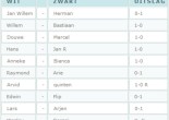 1 Jan Willem 315.66 2 Anneke 270.51 3 Herman 270.50 4 Arie 250.50 5 Ton 235.00 6 Arvid 229.33 7 Jan v O 205.66 8 Almar 194.33 9 Jan B … Lees verder