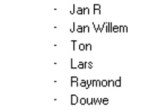 Jan Willem – HermanWillem – BastiaanDouwe – Marcel Hans – Jan RAnneke – BiancaRaymond – ArieArvid – QuintenEdwin – FlipLars – ArjenWesley – Sergei